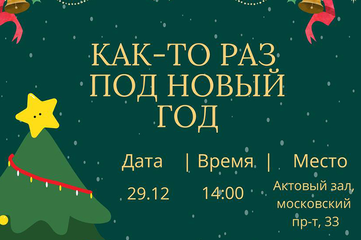 29-го декабря в 14:00 состоится новогодний спектакль для детей студентов, работников и преподавателей «Как-то раз под новый год», представленный театральной студией «Буклерон». Приглашаем всех желающих. Праздничное настроение и приятные сюрпризы гарантированы!