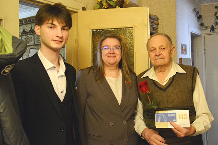 19-го ноября декан факультета математики и информационных технологий Елена Залесская вместе со студентом 2 курса Иваном Мирончиком поздравили ветерана труда Анатолия Федоровича Орещенко со 115-летием ВГУ имени П.М. Машерова.